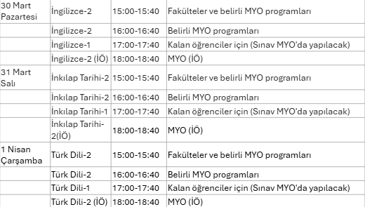 25 Mar 2026 2025-2026 BAHAR DÖNEMİ ZORUNLU ORTAK DERSLER ARA SINAV TARİHLERİ 2025–2026 Eğitim-Öğretim Yılı Bahar Dönemi kapsamında yürütülen zorunlu ortak derslere ait ara sınavlar, aşağıda belirtilen tarihlerde gerçekleştirilecektir.