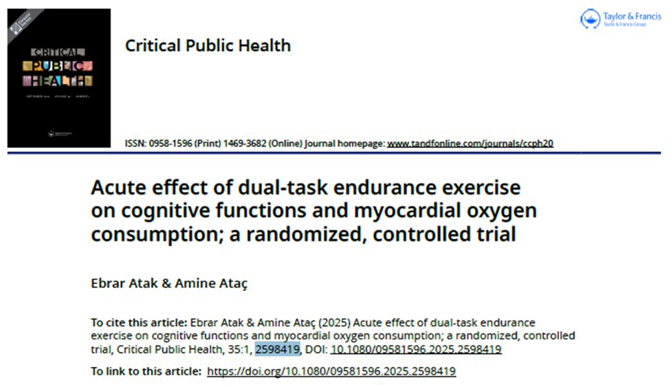 The original research article titled “Acute effect of dual-task endurance exercise on cognitive functions and myocardial oxygen consumption; a randomized, controlled trial”, authored by Asst. Prof. Amine Ataç from our university’s Department of Physiotherapy and Rehabilitation, has been published in Critical Public Health, a Web of Science (WOS) SCIE-indexed journal ranked in the Q2 category and published by Taylor & Francis.