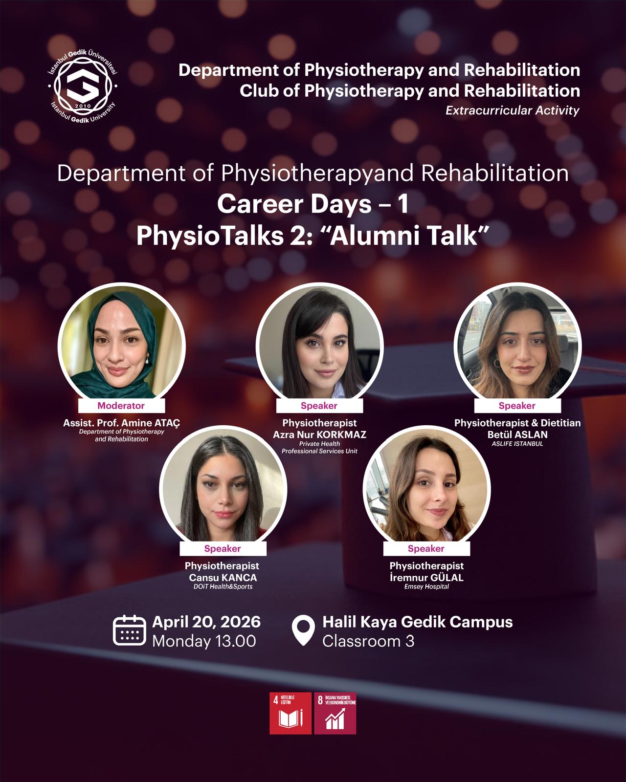 The PhysioTalks 2: Alumni Talk, organized within the scope of “Career Days – 1” by the Department of Physiotherapy and Rehabilitation and the Physiotherapy and Rehabilitation Student Club at Istanbul Gedik University, was held on April 20, 2026, at the Halil Kaya Gedik Campus with high participation.