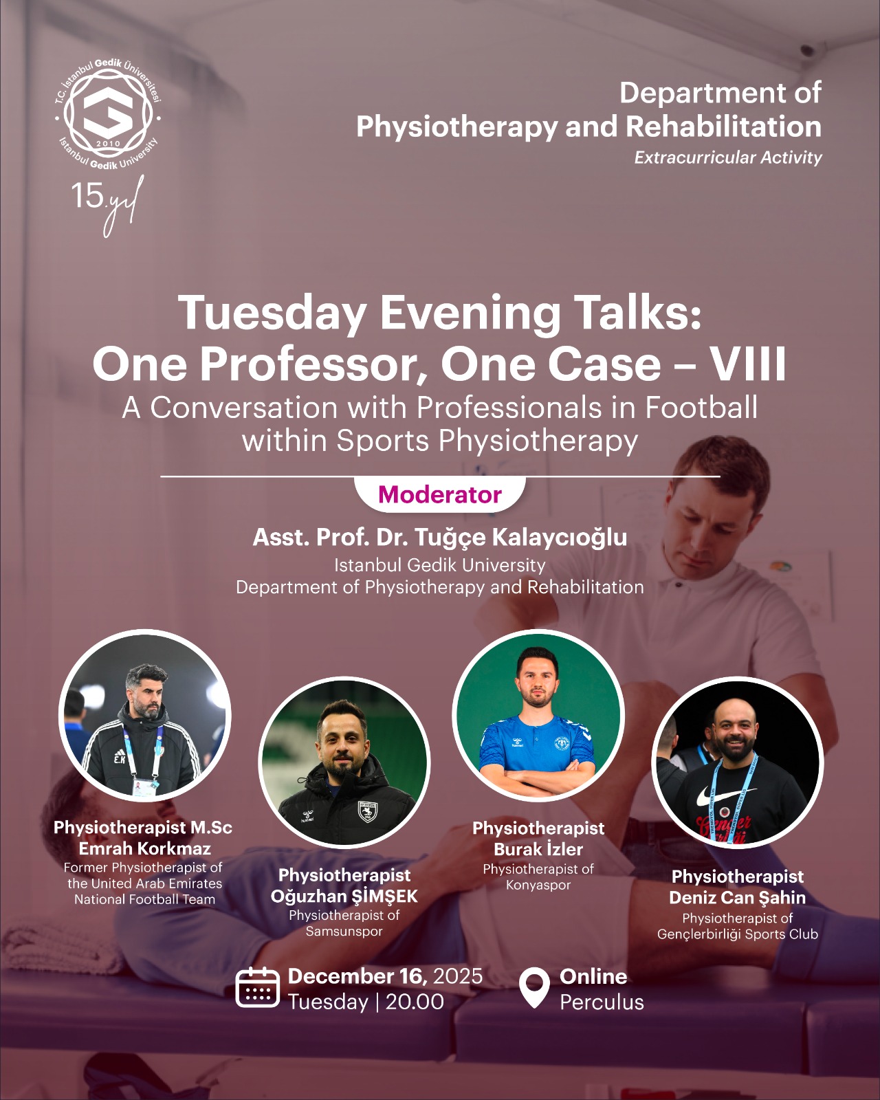 We would like to thank our speakers Physiotherapist, MSc Emrah Korkmaz, Physiotherapist Oğuzhan Şimşek, Physiotherapist Burak İzler, and Physiotherapist Deniz Can Şahin for their valuable contributions, as well as the event moderator Asst. Prof. Tuğçe Kalaycıoğlu for her efforts and dedication.