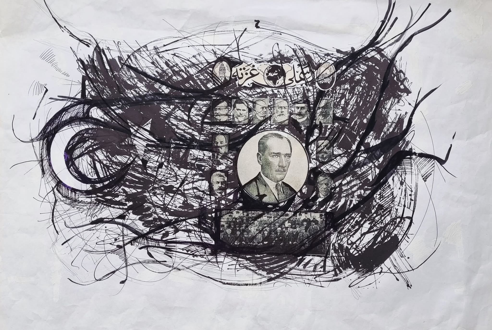 Within the scope of the exhibition, Ruhcan Akil presents the artwork titled “Head Teacher Mustafa Kemal Atatürk” (2025). The work measures 50 × 70 cm and is executed using Chinese ink and mixed media on paper, offering a contemporary artistic interpretation commemorating Atatürk’s role as Başöğretmen on the occasion of Teachers’ Day.