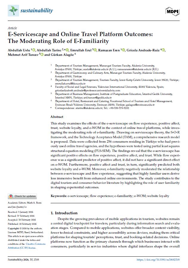 e Travel Platform Outcomes: The Moderating Role of E-Familiarity” başlıklı çalışması, Q2 kategorisinde yer alan, ”Sustainability” dergisinde yayımlanmıştır.