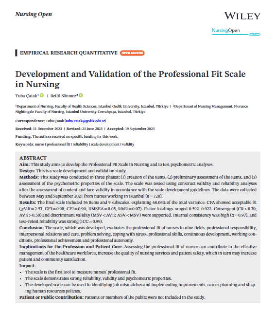 Nursing Open Dergisinde Yayın Başarısı: “Professional Fit Scale in Nursing”