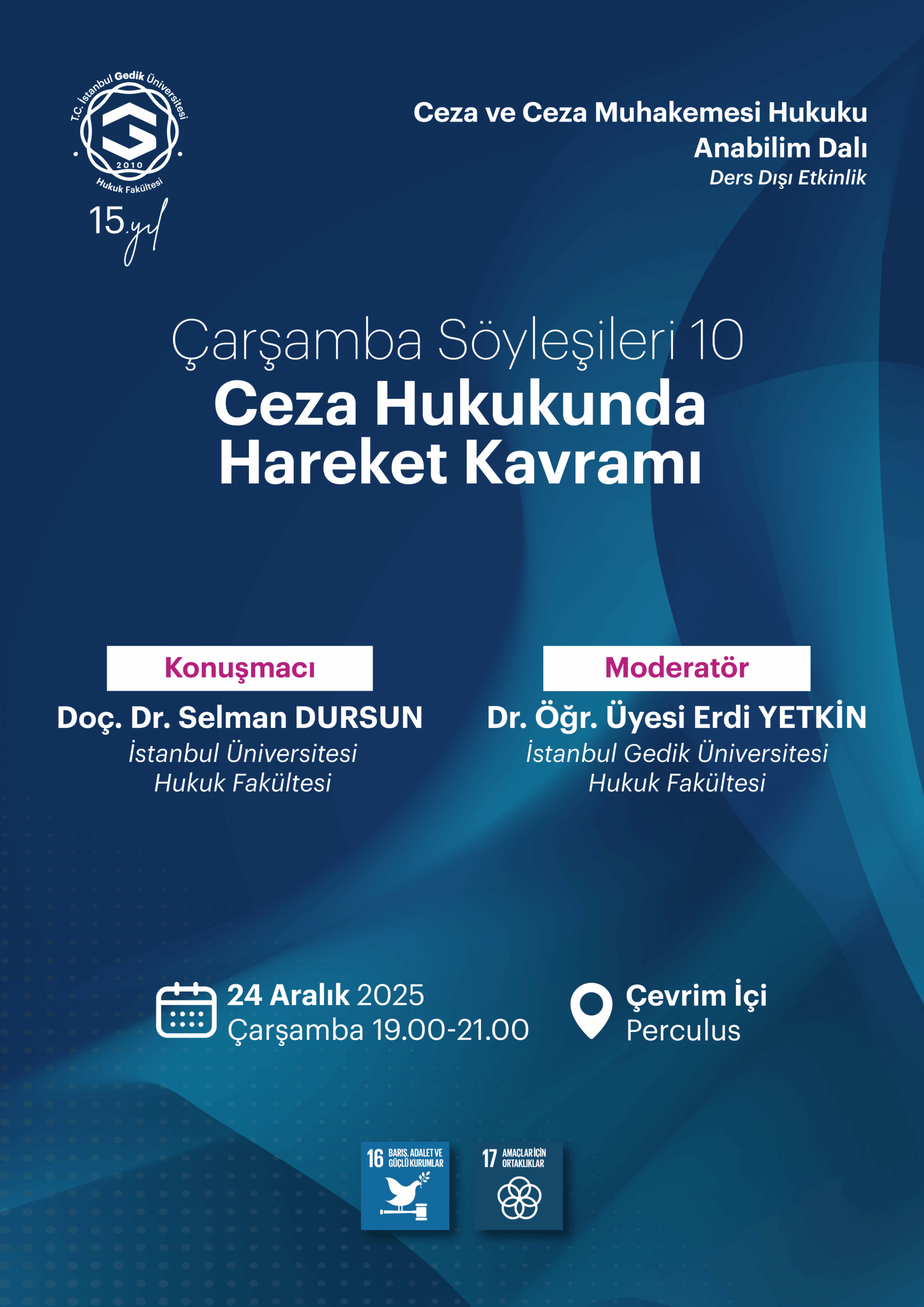 İstanbul Üniversitesi Hukuk Fakültesi Ceza ve Ceza Muhakemesi Hukuku Anabilim Dalı Öğretim Üyesi Doç. Dr. Selman Dursun’un konuşmacı olarak katılacağı ve İstanbul Gedik Üniversitesi Hukuk Fakültesi Ceza ve Ceza Muhakemesi Hukuku Anabilim Dalından Dr. Öğr. Üyesi Erdi Yetkin’in moderatörlüğünü üstleneceği Çarşamba Söyleşileri etkinliğimizin onuncusunda, “Ceza Hukukunda Hareket Kavramı” konusu ele alınacaktır. Etkinlik 24 Aralık 2025 Çarşamba günü 19:00 – 21:00 saatleri arasında Perculus sistemi üzerinden gerçekleştirilecek olup katılım linkini aşağıda bulabilirsiniz.