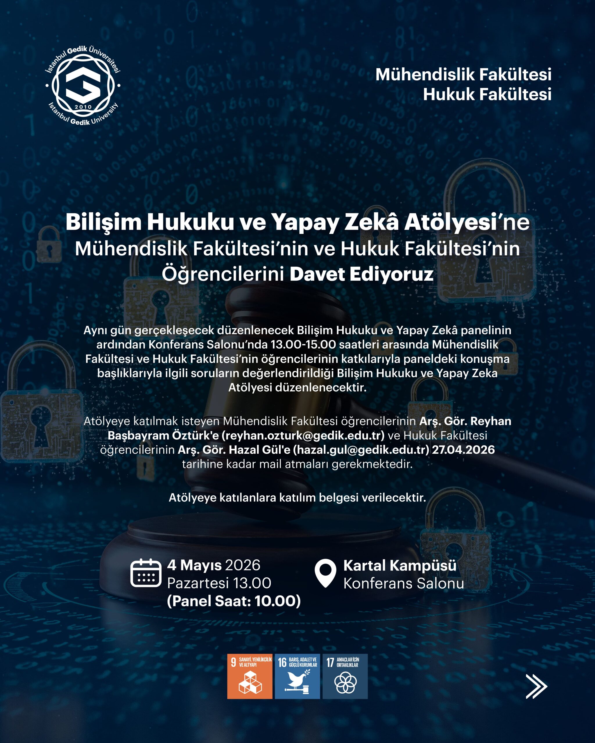 Atölyeye katılmak isteyen Mühendislik Fakültesi öğrencilerinin Arş. Gör. Arş. Gör. Reyhan Başbayram Öztürk ([email protected]), Hukuk Fakültesi öğrencilerinin Arş. Gör. Hazal Gül’e ([email protected]) mail atmaları gerekmektedir.