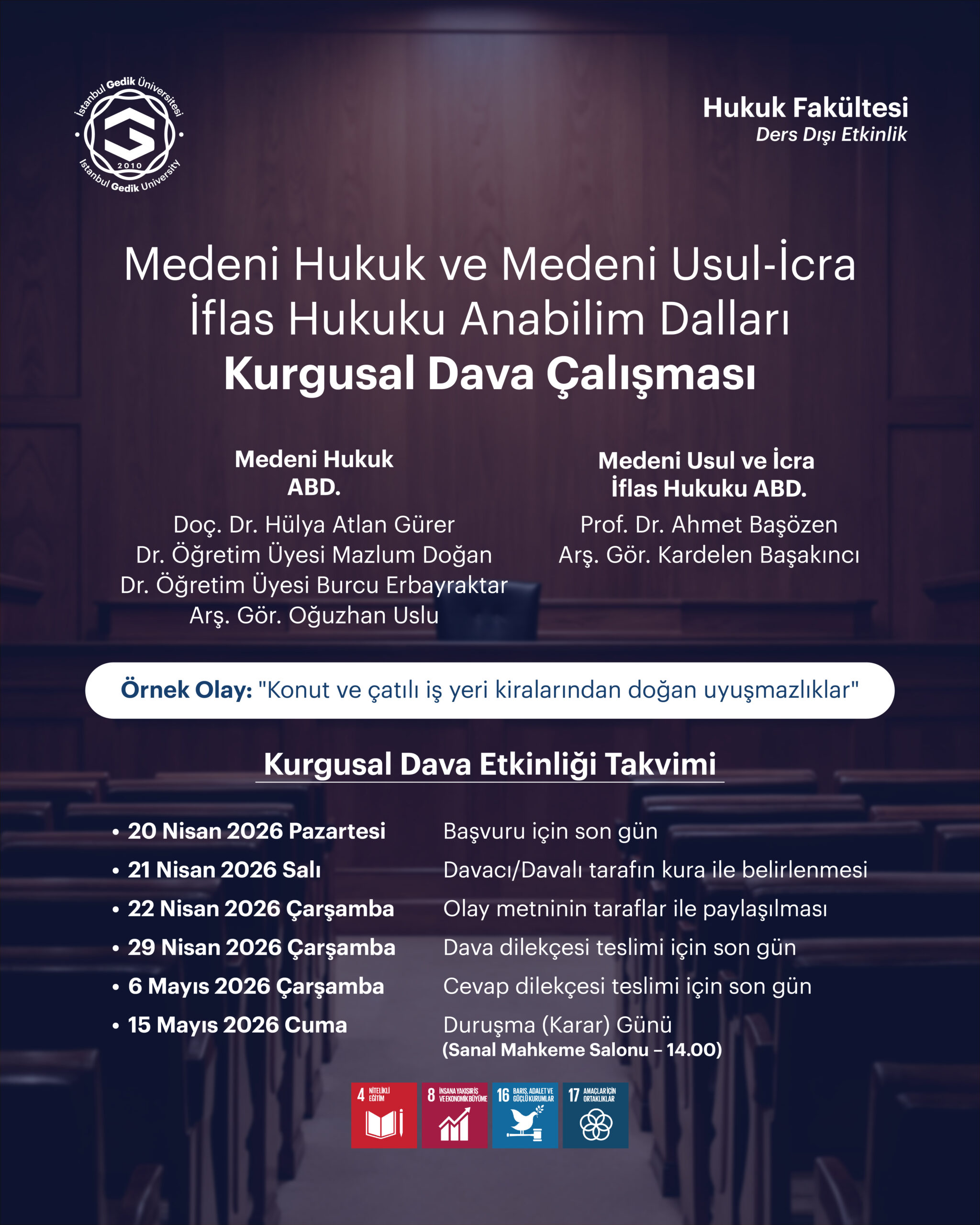 İstanbul Gedik Üniversitesi Hukuk Fakültesi Medeni Hukuk Anabilim Dalı ve Medeni Usul-İcra İflas Hukuku Anabilim Dalı tarafından kurgusal dava çalışması yapılacaktır. Konut ve çatılı iş yeri kiralarından doğan uyuşmazlıkların konu olduğu kurgusal dava çalışması sanal mahkeme salonunda (Z-101) yapılacak olup çalışma programının detayları afişte yer almaktadır. Tüm ilgili öğrencilerimizi bekleriz.
