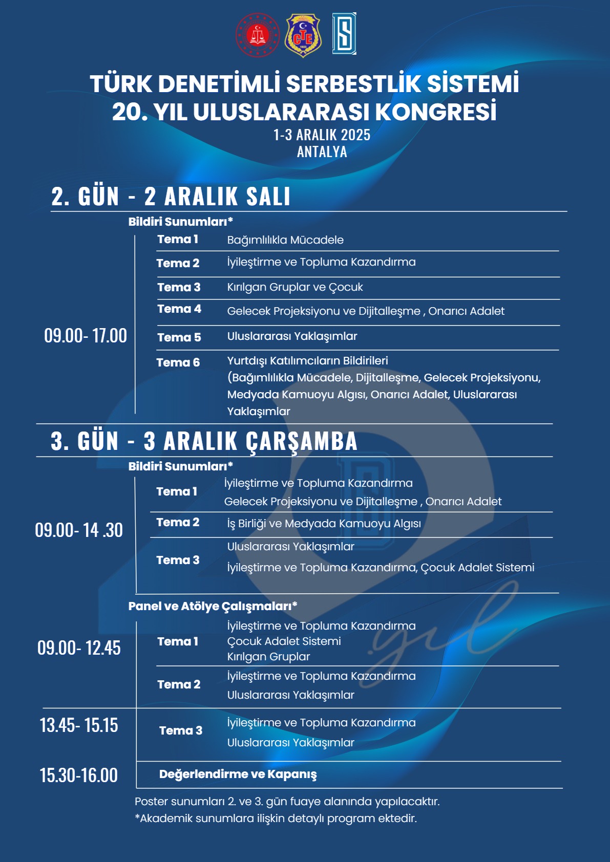 Fakültemiz Ceza ve Ceza Muhakemesi Hukuku Anabilim Dalı Öğretim Üyesi Dr. Erdi Yetkin 1–3 Aralık 2025 tarihlerinde Adalet Teşkilatını Güçlendirme Vakfı Antalya Eğitim ve Sosyal Tesisleri’nde gerçekleştirilecek Türk Denetimli Serbestlik Sistemi 20. Yıl Uluslararası Kongresi’nde 2 Aralık günü “Denetimli Serbestlik Tedbirleriyle Desteklenen Adli Tevbihin Çocuk Ceza Adalet Sisteminde Uygulanabilirliği” konulu bildirisini sunacaktır.
