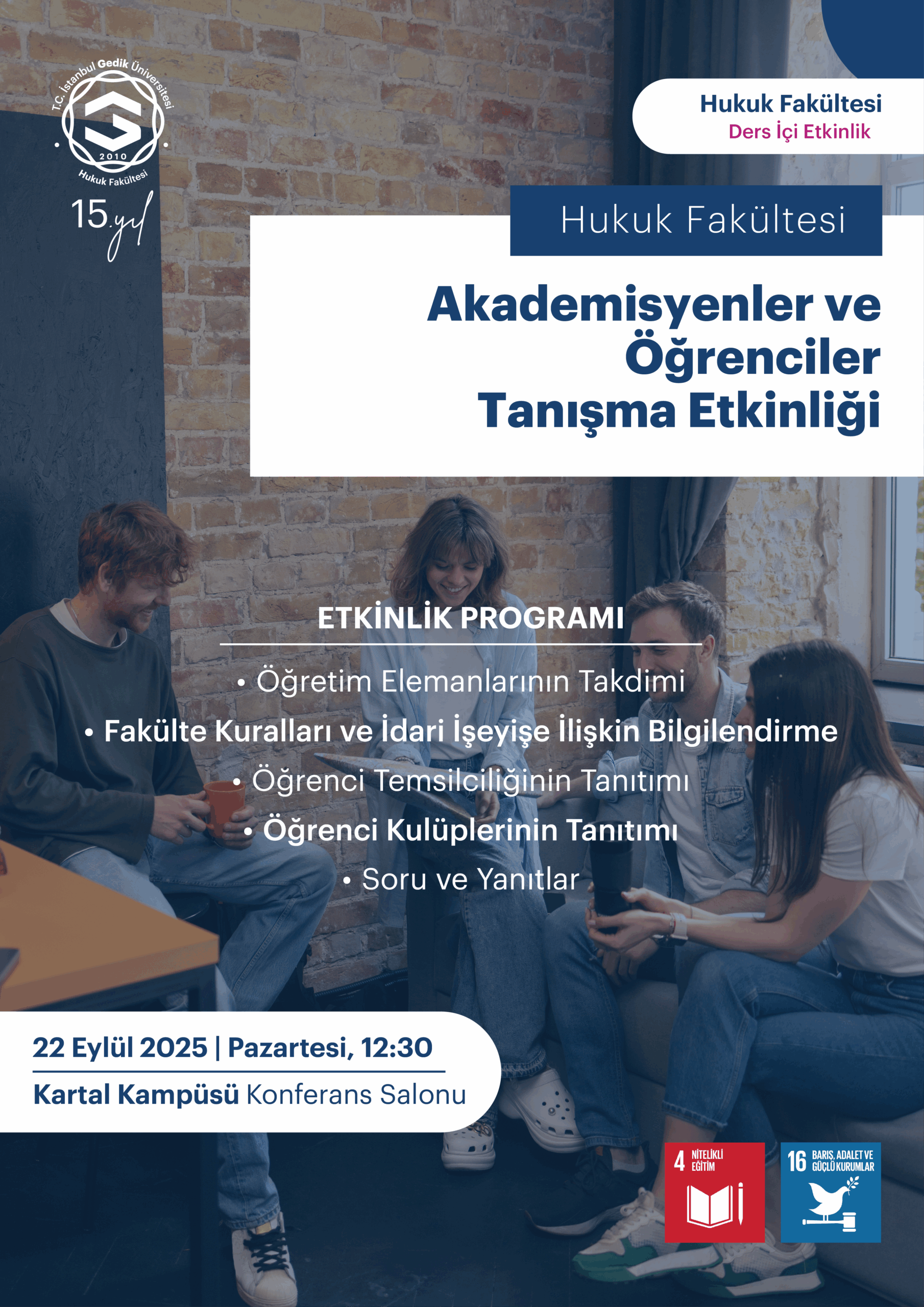 22 Eylül 2025 Pazartesi günü saat 12:30’da Kartal Kampüsü Konferans Salonunda İstanbul Gedik Üniversitesi Hukuk Fakültesi Akademisyenleri ve Öğrencileri Tanışma Etkinliği gerçekleştirilecektir.