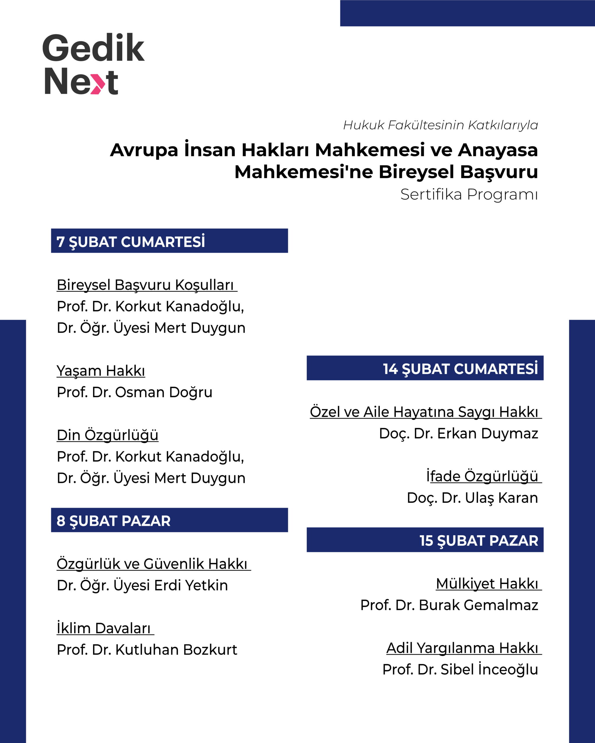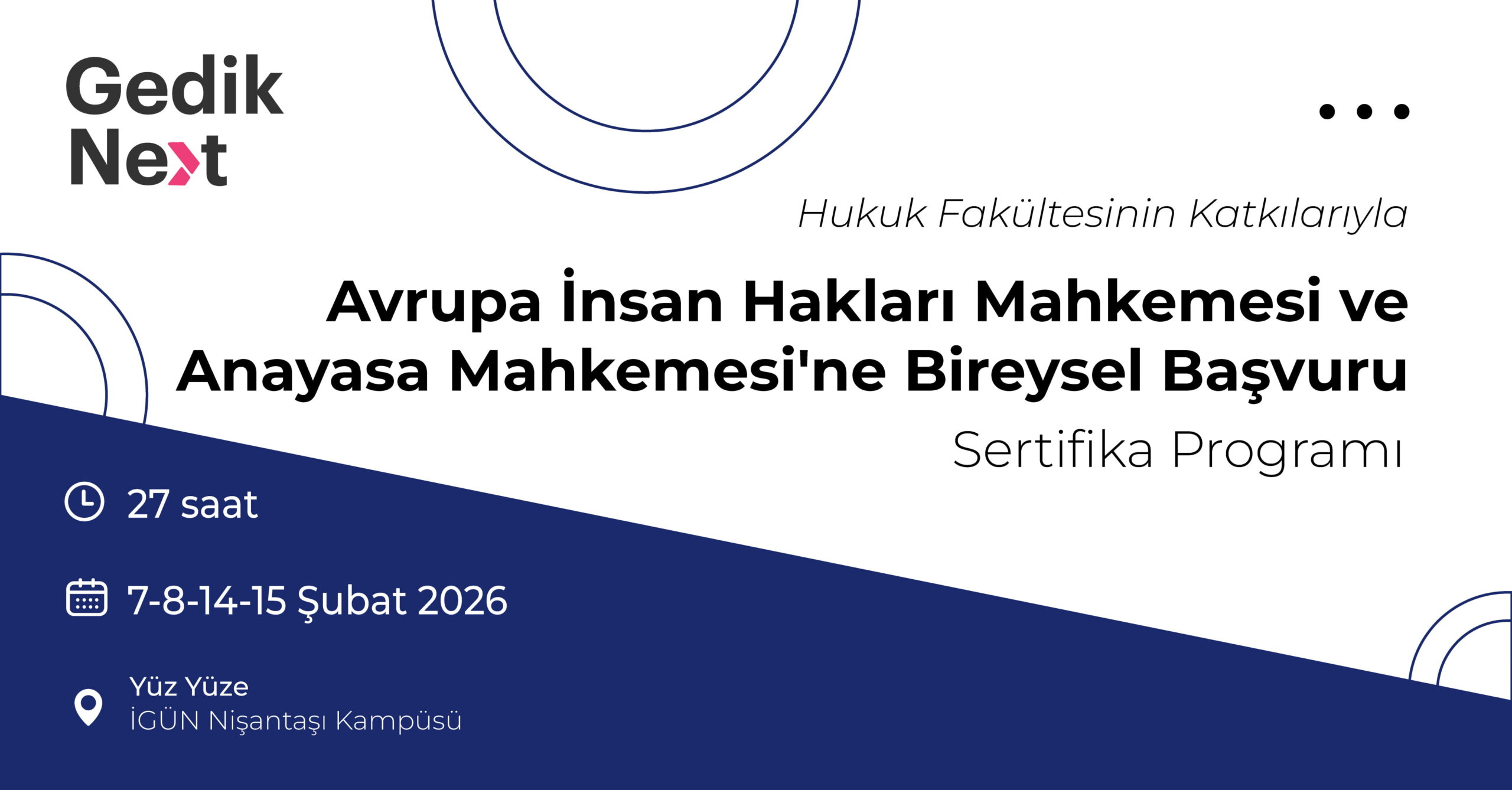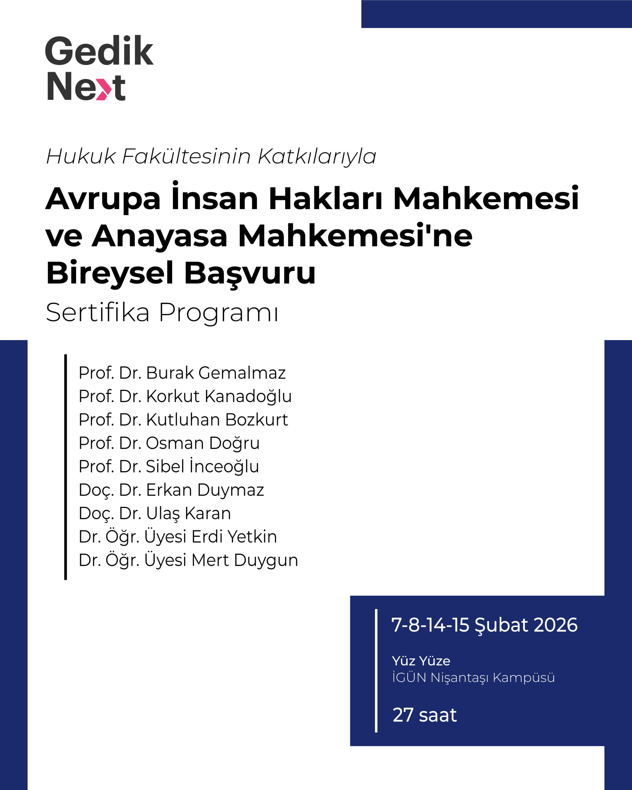 “Hukuk Fakültesi’nin katkılarıyla “AİHM ve AYM’ye Bireysel Başvuru Sertifika Programı”, İstanbul Gedik Üniversitesi Sürekli Eğitim Merkezi tarafından 7-8-14-15 Şubat 2026 tarihlerinde İGÜN Nişantaşı kampüsünde düzenlenecektir.