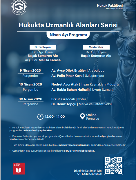 – Hukuk Fakültesi mezunlarının istihdam alanı bulabileceği farklı alanlardan uzmanları konuk ettiğimiz programlar online olarak yapılacaktır.