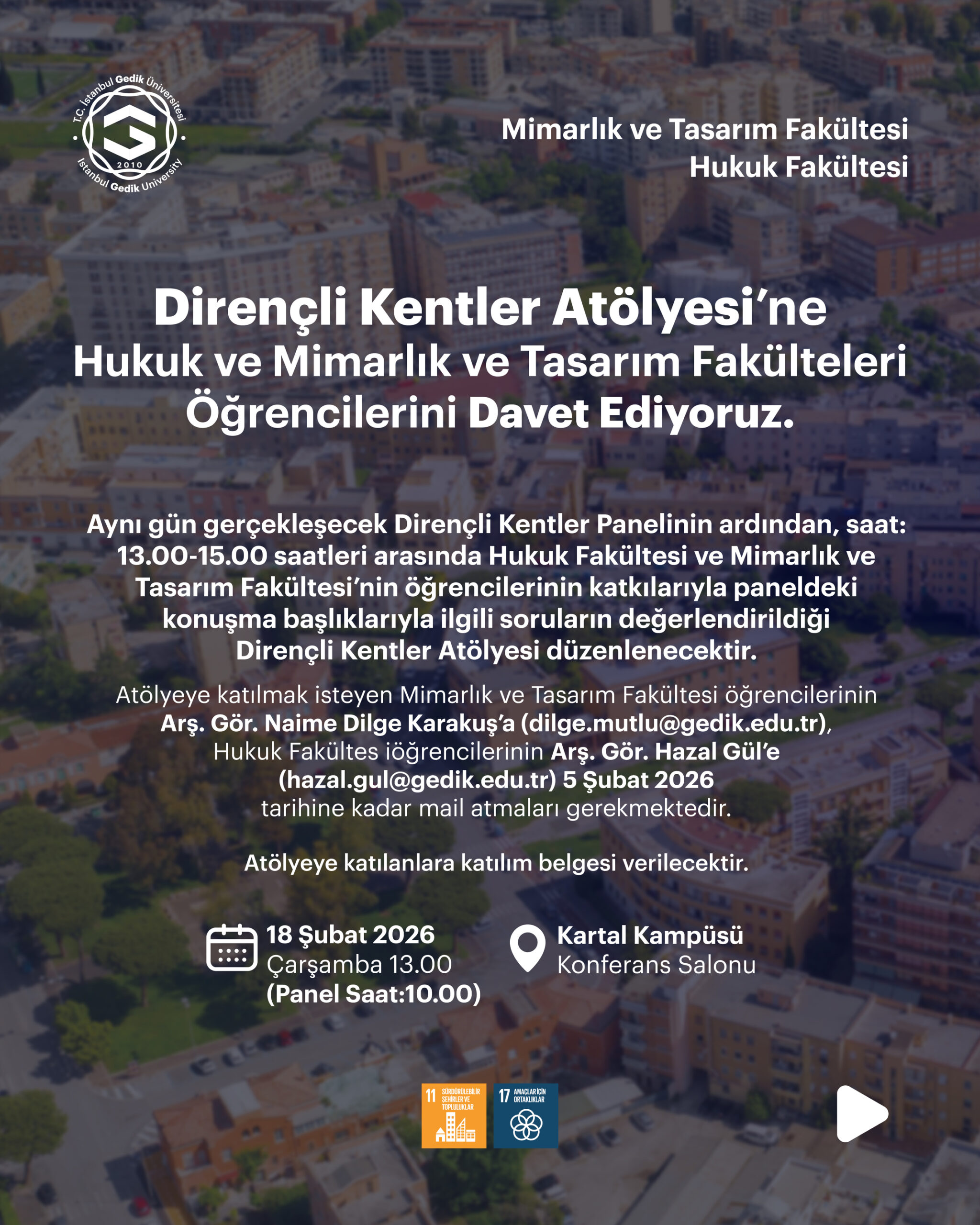 Atölyeye katılmak isteyen Mimarlık ve Tasarım Fakültesi öğrencilerinin Arş. Gör. Naime Dilge Karakuş’a (dilge.mutlu@gedik.edu.tr), Hukuk Fakültesi öğrencilerinin Arş. Gör. Hazal Gül’e (hazal.gul@gedik.edu.tr) 5 Şubat 2026 tarihine kadar mail atmaları gerekmektedir.