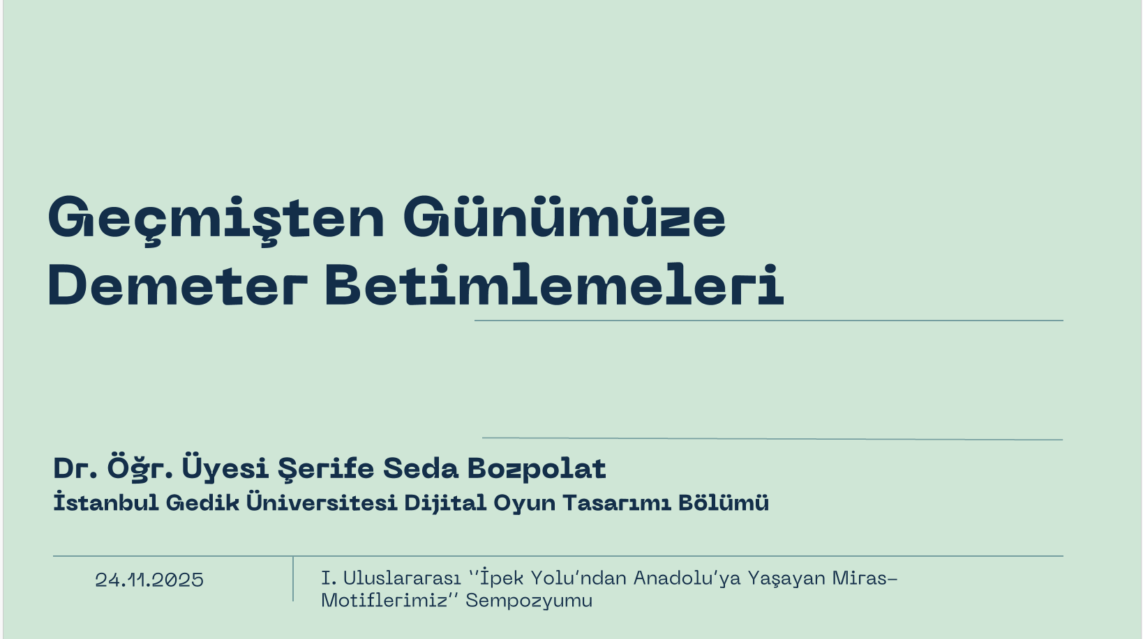Mimarlık ve Tasarım Fakültesi Dijital Oyun Tasarımı Bölüm Başkan Yardımcısı Dr. Öğr. Üyesi Şerife Seda Bozpolat, Kütahya Dumlupınar Üniversitesi tarafından 24 Kasım 2025 tarihinde çevrimiçi olarak düzenlenen I. Uluslararası “İpek Yolu’ndan Anadolu’ya: Yaşayan Miras – Motiflerimiz Sempozyumunda “Geçmişten Günümüze Demeter Betimlemeleri” başlıklı sözlü bildiri sunumunu yapmıştır.