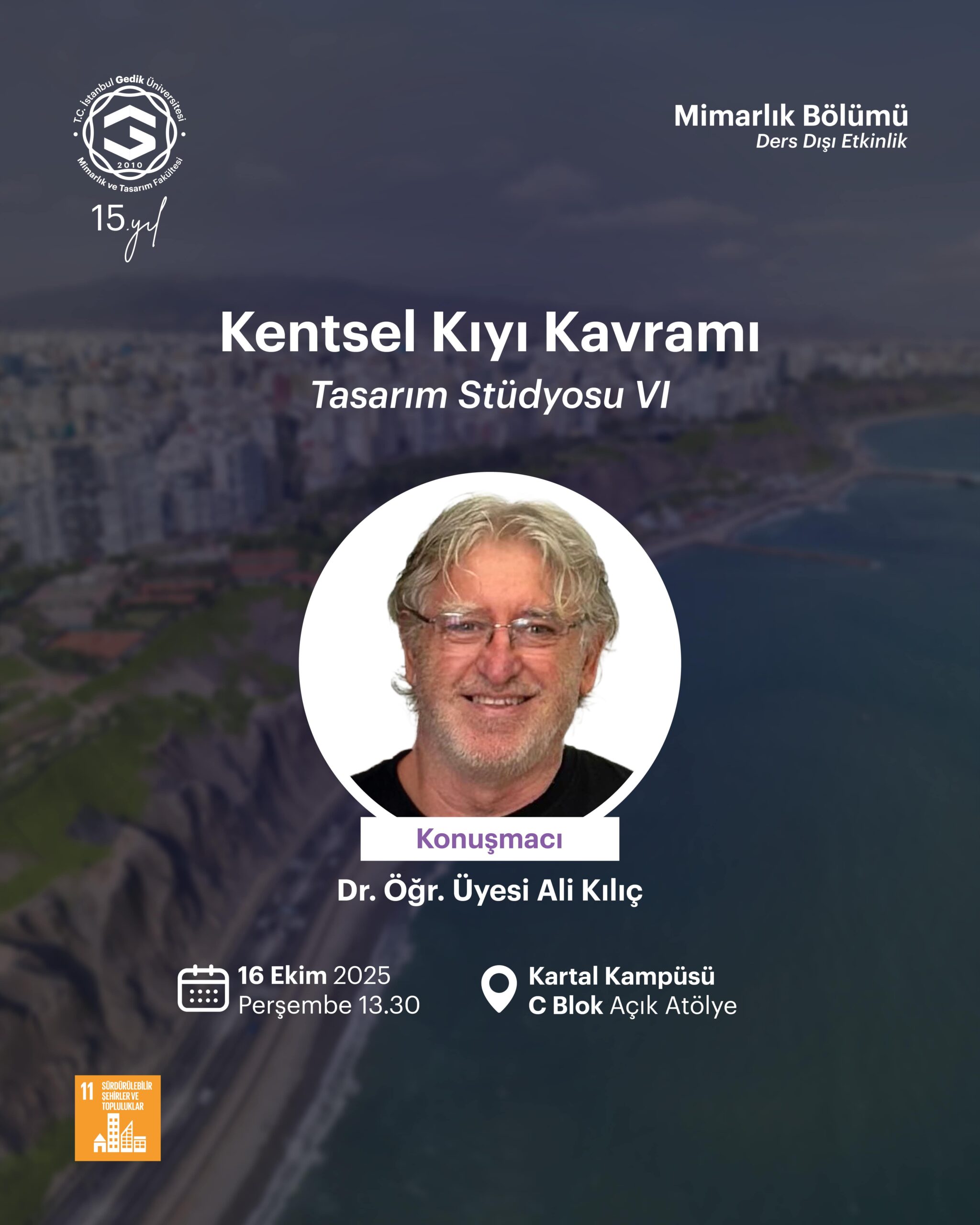 2025–2026 Eğitim-Öğretim Yılı Güz Dönemi Mimarlık Bölümü Tasarım Stüdyosu VI dersi kapsamında, Dr. Öğr. Üyesi Ali Kılıç tarafından 16.10.2025 tarihinde saat 13.30’da, C Blok Açık Atölye’de “Kentsel Kıyı Kavramı” konulu seminer gerçekleştirilmiştir.