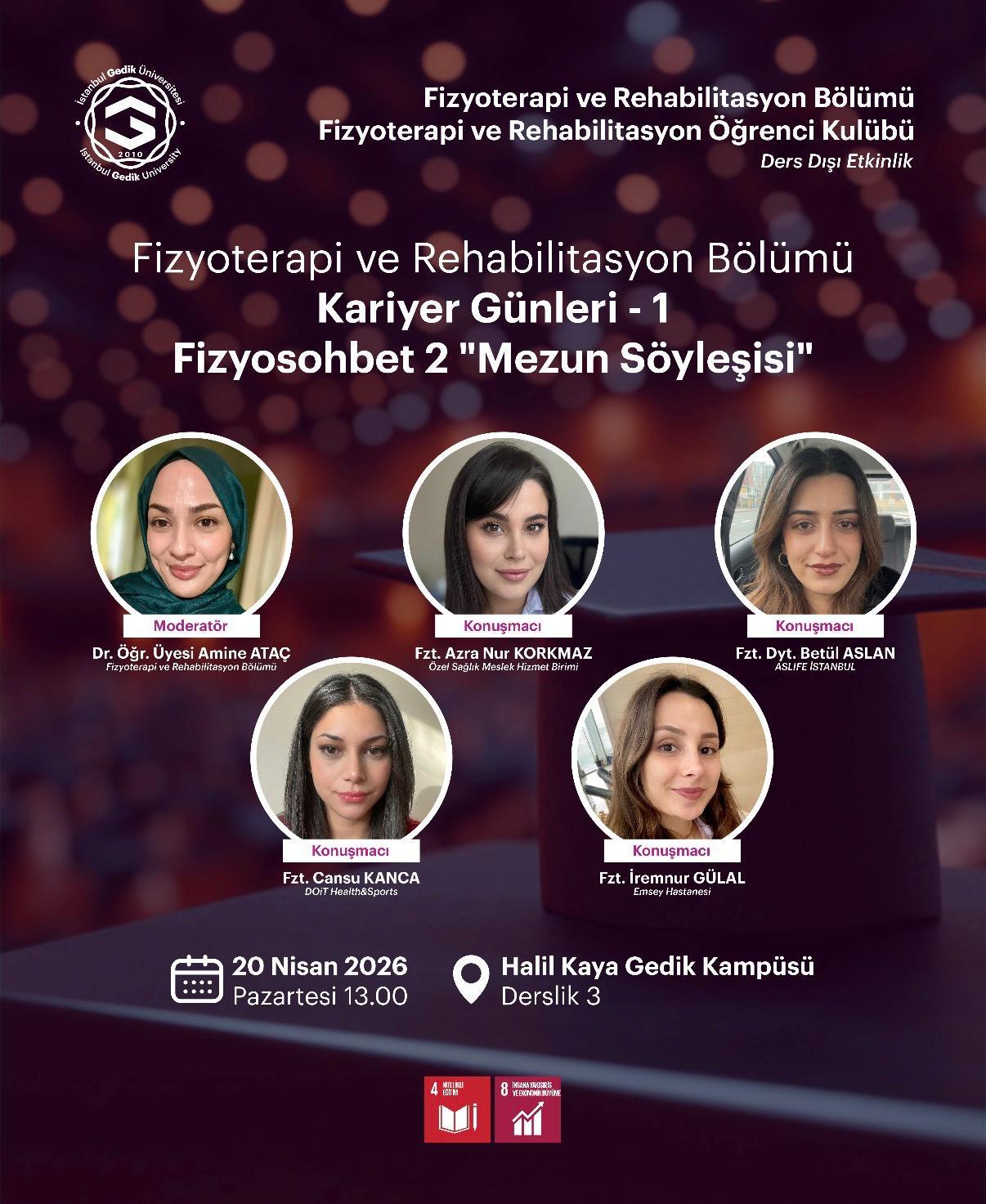 İstanbul Gedik Üniversitesi Fizyoterapi ve Rehabilitasyon Bölümü ile Fizyoterapi ve Rehabilitasyon Öğrenci Kulübü iş birliğinde düzenlenen “Kariyer Günleri – 1” etkinliği kapsamında gerçekleştirilen “Fizyosohbet 2: Mezun Söyleşisi”, 20 Nisan 2026 tarihinde Halil Kaya Gedik Kampüsü’nde yoğun katılımla gerçekleştirildi.