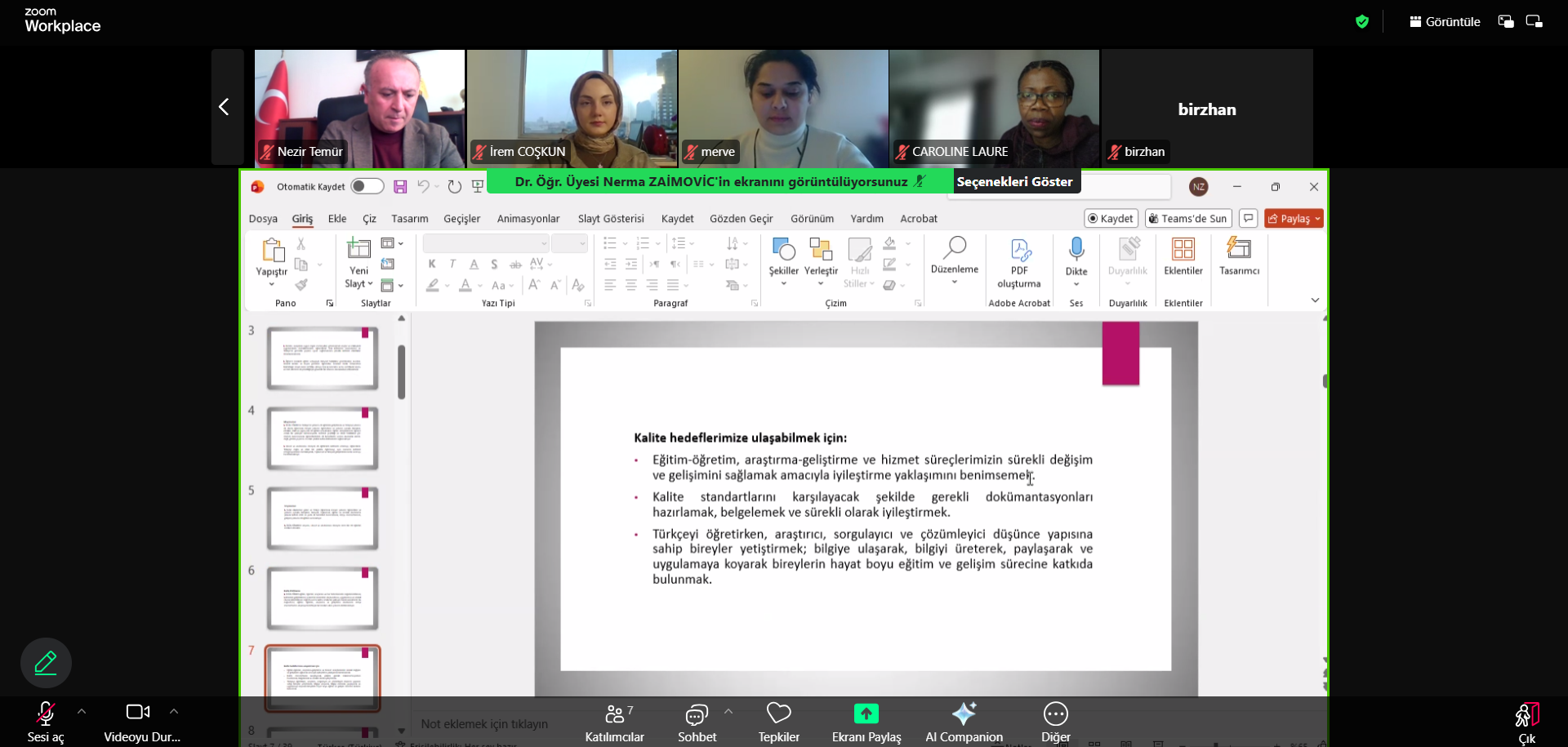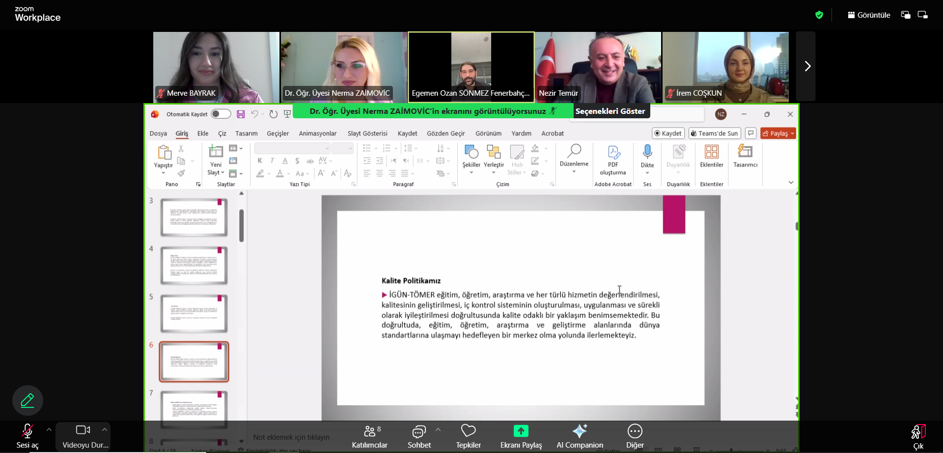 Ağustos 2025-Ocak 2026 dönemine ait faaliyetlerin ele alındığı toplantı, Merkez Müdürü Dr. Öğr. Üyesi Nerma ZAİMOVİC’in açılış konuşmasıyla başlamıştır. Toplantıda; İGÜN-TÖMER’in eğitim-öğretim faaliyetleri, Türkçe hazırlık programlarının yapısı ve kur süreçleri, ölçme ve değerlendirme uygulamaları, kalite güvencesi çalışmaları, akademik dürüstlük ve yapay zekâ kullanım politikaları, sınav ve sertifikasyon süreçleri ile 01.09.2025-30.01.2026 tarihleri arasında gerçekleştirilen faaliyetler ve öğrenci istatistikleri değerlendirilmiştir.