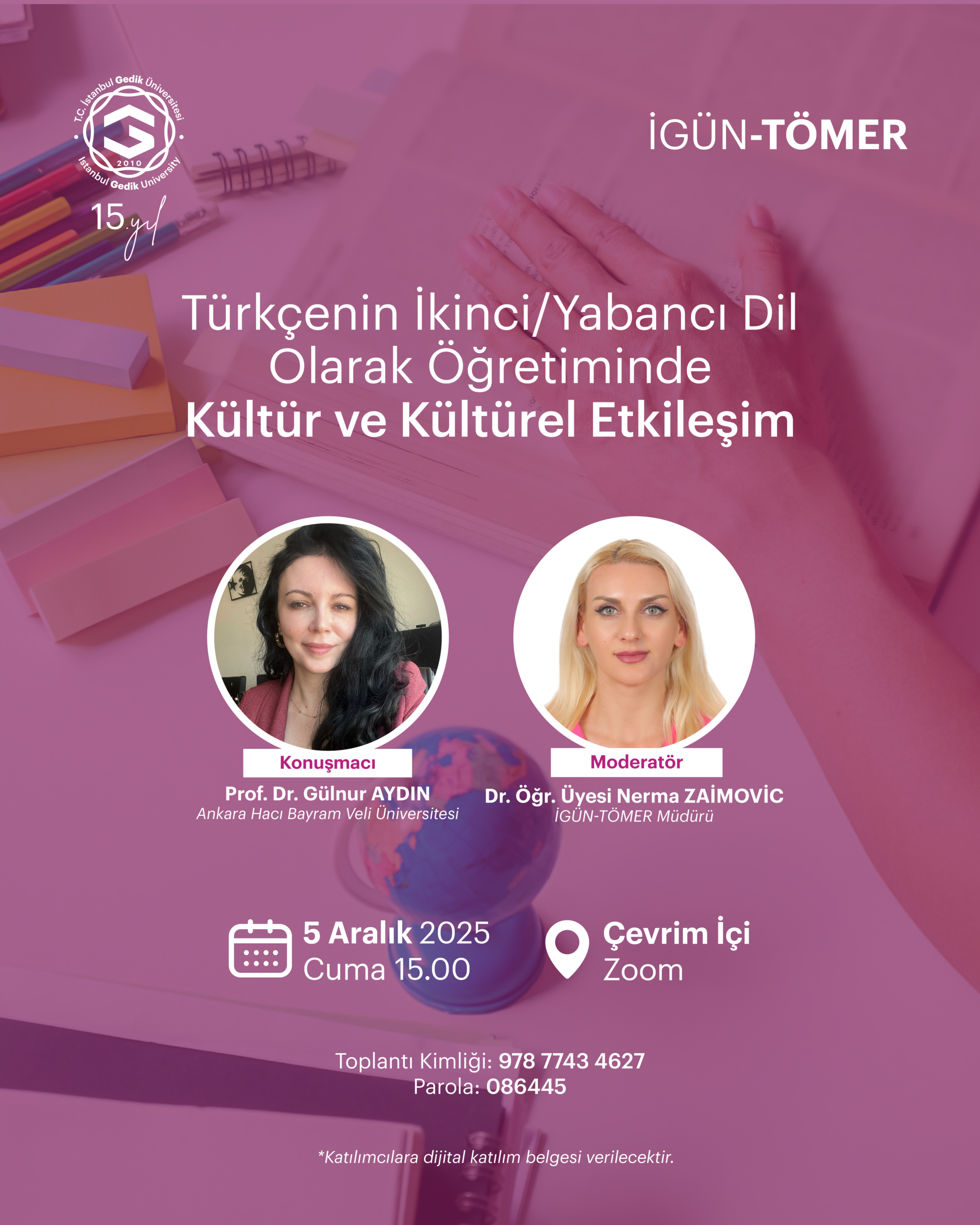 İstanbul Gedik Üniversitesi Türkçe Öğretimi Uygulama ve Araştırma Merkezi (İGÜN-TÖMER) tarafından, 05 Aralık 2025 tarihinde “Türkçenin İkinci/Yabancı Dil Olarak Öğretiminde Kültür ve Kültürel Etkileşim” başlıklı çevrim içi bir toplantı düzenlendi.