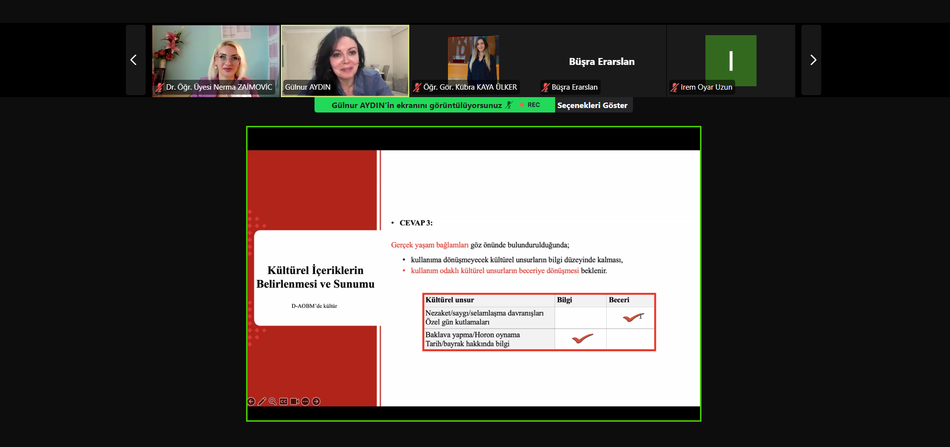 Etkinlikte, katılımcılar Türkçenin yabancı dil olarak öğretiminde kültürel unsurların önemine, kültürlerarası etkileşimin öğretim süreçlerine katkısına ve dil-kültür ilişkisine yönelik değerlendirmelerde bulundu.