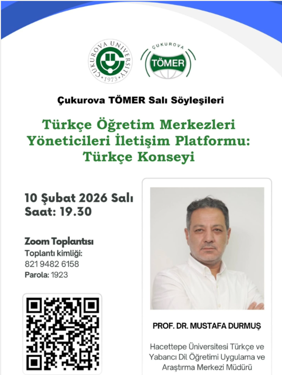 Çukurova Üniversitesi TÖMER Salı Söyleşileri kapsamında düzenlenen “Türkçe Öğretim Merkezleri Yöneticileri İletişim Platformu: Türkçe Konseyi” toplantısı, 10 Şubat 2026 tarihinde Hacettepe Üniversitesi Türkçe ve Yabancı Dil Öğretimi Uygulama ve Araştırma Merkezi Müdürü Prof. Dr. Mustafa DURMUŞ’un katılımıyla gerçekleştirildi.