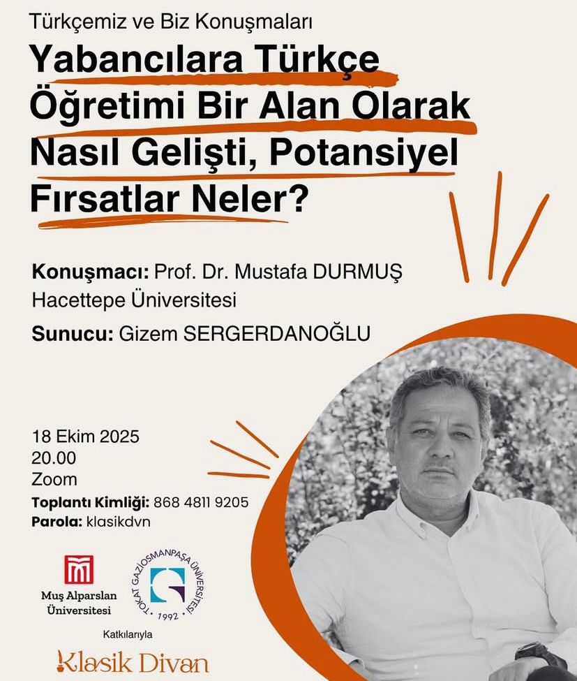 Muş Alparslan Üniversitesi TÖMER ve Tokat Gaziosmanpaşa Üniversitesi TÖMER iş birliğiyle düzenlenen “Türkçemiz ve Biz Konuşmaları” serisinin ikinci oturumu, Hacettepe Üniversitesi TÖMER Müdürü Prof. Dr. Mustafa DURMUŞ’un katılımıyla gerçekleştirildi.