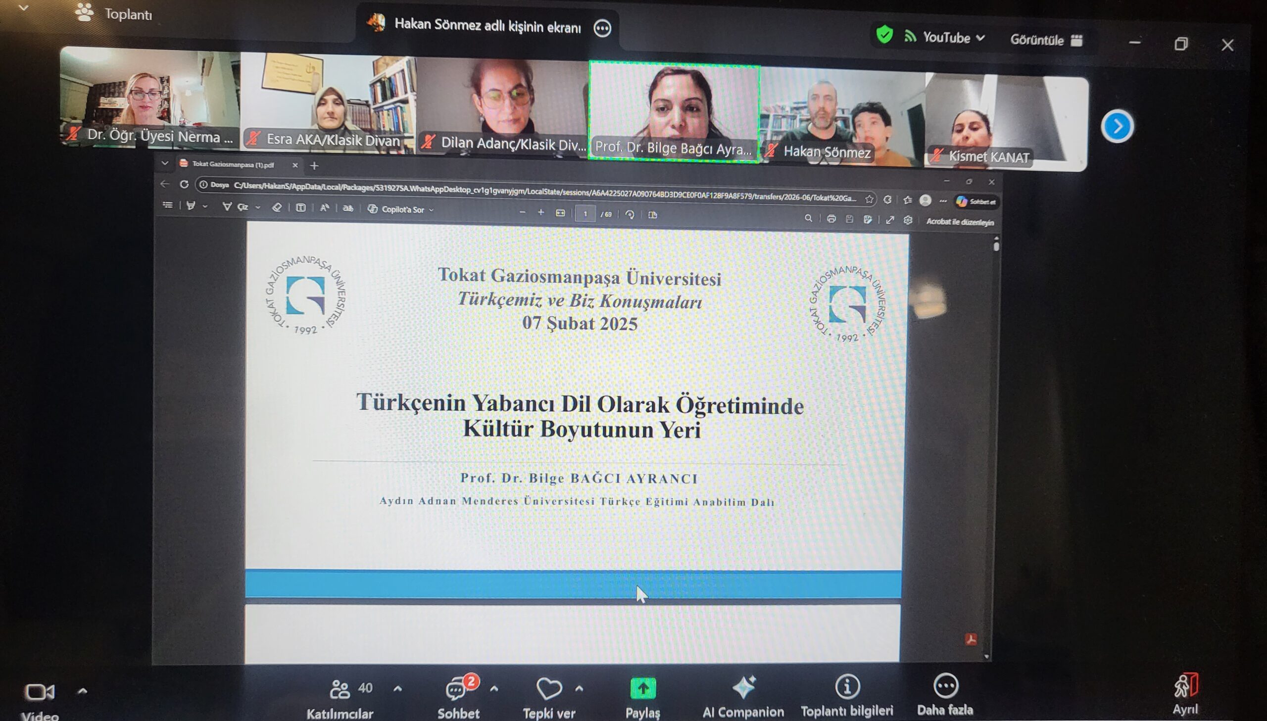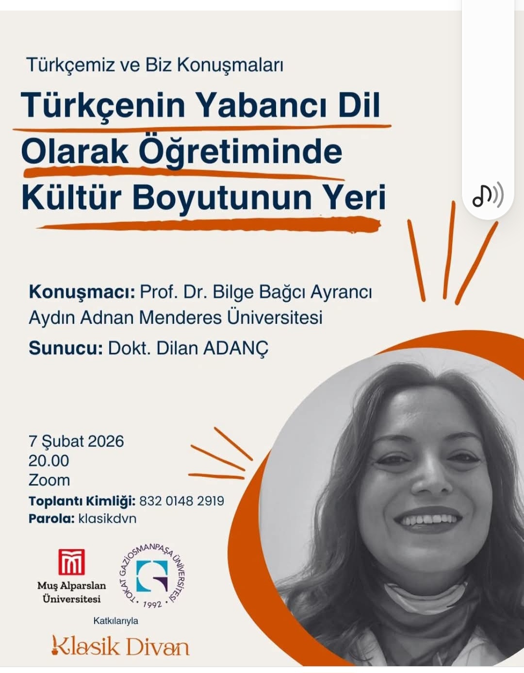 Muş Alparslan Üniversitesi TÖMER ve Tokat Gaziosmanpaşa Üniversitesi TÖMER iş birliğiyle düzenlenen “Türkçemiz ve Biz Konuşmaları” serisinin 7 Şubat 2026 oturumu, Aydın Adnan Menderes Üniversitesi Öğretim Üyesi Prof. Dr. Bilge BAĞCI AYRANCI’nın katılımıyla gerçekleştirildi.