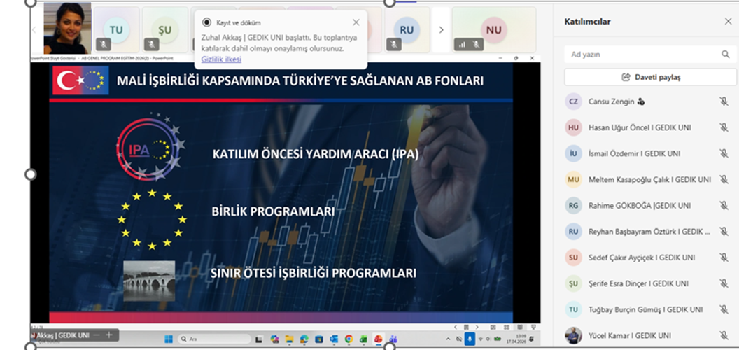 Üniversitemiz Teknoloji Transfer Ofisi Koordinatörlüğü tarafından, değerli araştırmacılarımıza yönelik ‘AB Projeleri Genel Bilgilendirme ve AB Fon Dünyasına Genel Bakış’ eğitimi başarıyla gerçekleştirilmiştir. Eğitimde; 2021-2027 dönemini kapsayan güncel hibe programları ve uluslararası iş birliği süreçleri hakkında detaylı bilgilendirmeler yapılmıştır.